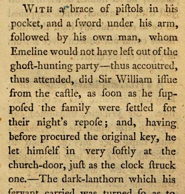 Yep, a character named Sir William Montreville sets out late at night, armed with piftols and fword — uhm, pistols and sword — for some ghost-hunting with his servant! Earlier, the character interviews those who claim to have witnessed a specter at the church. While remaining skeptical, he promises “he would himself go in search of this terrible ghost.” Upon arriving at the site said to be haunted, Sir William sits hidden in a pew, watching and waiting. Nocturnal surveillance — the hallmark of ghost hunters since Athenodorus! In other words, this use of ghost-hunting isn’t a way of saying a fool’s errand or some other figure of speech. Though intending to debunk the haunting, Sir William is acting as a ghost hunter in the way I suspect most people today apply that label.