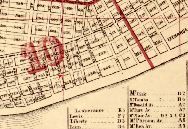 The article is pretty specific about where the ghost ran: “Main near Mullanphy” and on and beneath a bridge built at Mound Street. Attempting to match these 1902 sites to what’s there today, I started with an 1870 map. A lot can change in 32 years, but this was the best I could find. Mullanphy and Mound are both still there, but at some point, the stretch of Main Street between them was renamed Commercial, according to the Google map. (Meanwhile, not far away, 2nd Street was renamed 1st. Broadway retains its name along with some of the area’s other cross streets, such as Brooklyn, Florida, and O’Fallon.) In other words, assuming 1870’s Main and Mullanphy was the same spot in 1902, it’s now Commercial and Mullanphy.