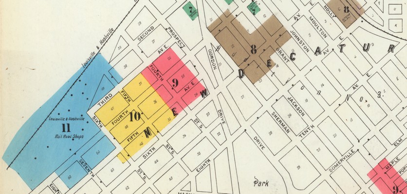 While I couldn’t find out anything more about the otherworldly encounter, there’s good information available to locate the grounds where it allegedly happened. The Alabama town of New Decatur, as it’s identified in the article, is now simply called Decatur. A map published in 1903 clearly marks the grounds of the Louisville & Nashville Railroad shops. They were on the blue section of the map, which I spotlight below. Well over a century later, the streets remain almost exactly the same, but the old map is at a particular angle. A helpful spot for orientation is the meeting of Third Avenue and Sixth Street, southwest of Delano Park. You can find it on the Google map.