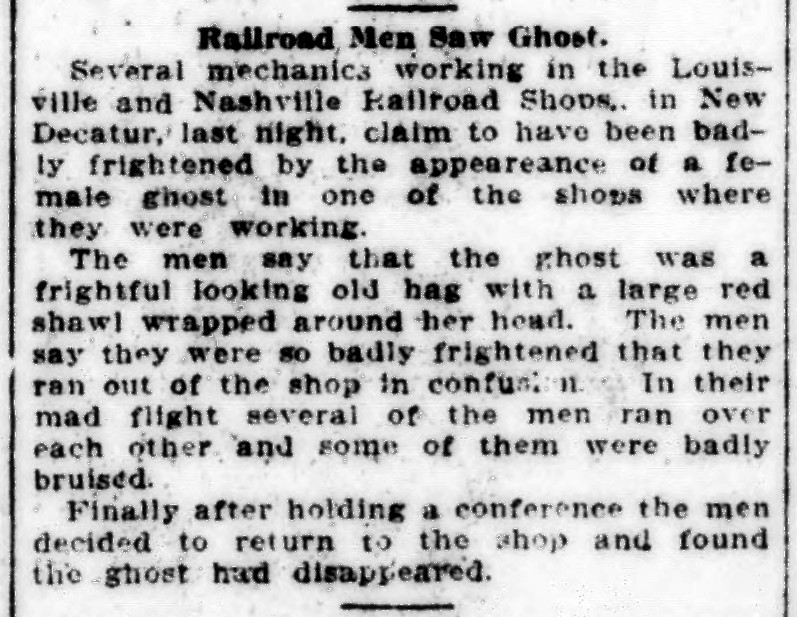 I’ve been collecting old newspaper ghost reports long enough to consider where each new one falls between journalism and folklore. I recently found a 1905 article titled “Railroad Men Saw Ghost.” Since it’s about a team of train mechanics in Alabama fleeing from an “old hag with a large red shawl wrapped around her head,” I felt as if I had something leaning hard toward legend instead of fact. I then discovered that, sure enough, books a bit older than the news report mention similarly appareled frights in Celtic folklore, the red shawl being shorthand for RUN AND HIDE!