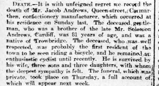 That Solomon Andrews mentioned in the obituary was a pretty big deal in a variety of businesses across Wales, from local bus services to real estate development. He’s worthy of a post of his own, but I’m going to leave that to someone else.