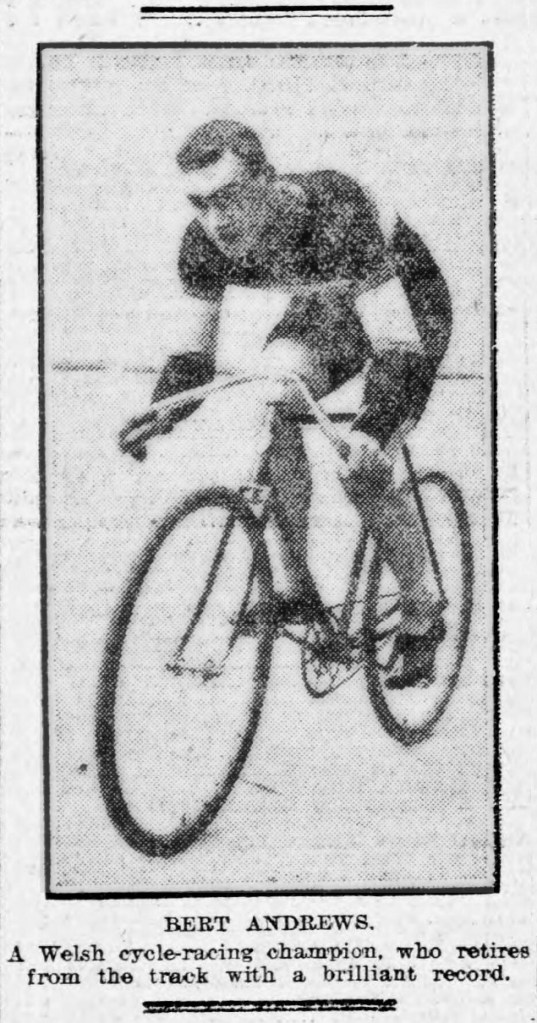 The Carmarthen newspapers that figured readers would want to know about Bertie’s fall from a bicycle also kept tabs on his accomplishments as a racer. For instance, the Journal announced his being chosen to ride for Wales against the London Polytechnic Club (9th May 1902, p. 5) while the Weekly Reporter explained that, at a benefit held by area athletes for one of their own, Bertie was considered to be “the best cyclist on the ground that day” (18th July 1902, p. 2).