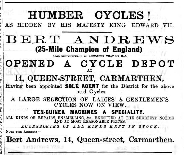 An ad for Bert Andrews’ “cycle depot” from The Carmarthen Journal and South Wales Weekly Advertiser (27th March 1903, p. 3)