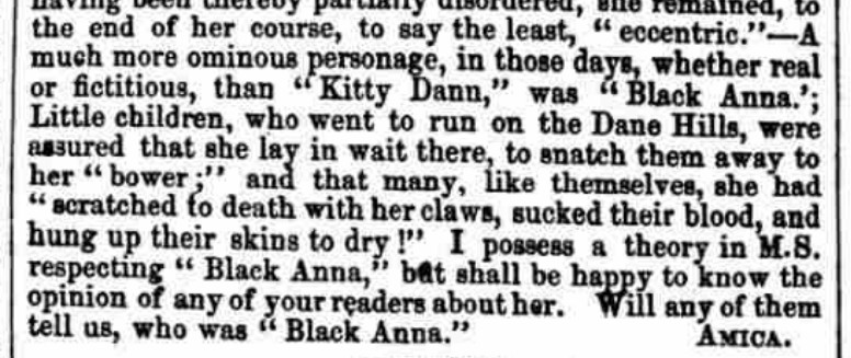 The depiction resurfaced in 1846, when John Dudley’s Naology was published. There, the legendary resident of Black Annis’s Bower is said to be “a savage woman with great teeth, and long nails” who “devoured human victims.” In 1874, it was reiterated in an exchange printed in multiple issues of The Leicester Chronicle. Every Saturday, this newspaper offered space for readers to ask questions that might be answered by other readers in future issues. On September 5, someone using the name “Amica” asked what anyone knew about “Black Anna,” clearly referring to the same legend.