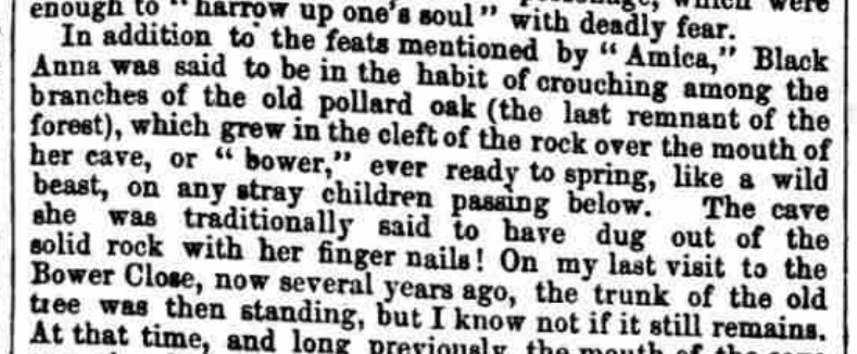 This writer goes on to discuss the cave itself and various theories about the person for whom it’s named. He notes that such conjectures disagree on a specific name — Black Agnes? Black Anna? Black Annis? — contending that the latter surname is “still found amongst us” and likely belongs to the property owner. However, in the November 7, 1874, issue, John Mellor joined the Chronicle conversation to say he had located land deeds from 1764 that name the spot as “Black Anny’s Bower Close.” Of course, these are attempts to pin down a historical person, not a legendary one. Given Heyrick’s use of “Annis,” I think we’re safe going with that name when describing the folkloric figure.