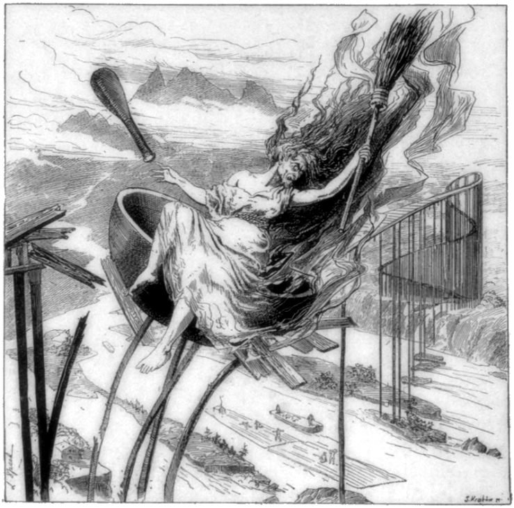 Baba Yaga has a pivotal — yet relatively minor — role in the folktale “Marya Morevna,” a.k.a. “The Death of Koshchei the Deathless.” Prince Ivan is the protagonist, Koschei the Deathless is the antagonist, and Marya Morevna is the “prize” over whom they fight. This is one of many Russian folktales transcribed by Alexander Afanasyev and then translated into English by W.R.S. Ralston (1873), Nathan Haskell Dole (1907), and Leonard A. Magnus (1916). I’ll be following Ralston’s version.
