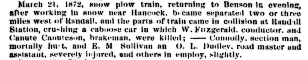 While an article on the March 21 train wreck on the St. Paul & Pacific Railroad — cited as the accident that killed Connelly — doesn’t mention a victim by that name, a subsequent and more officious report does. The two sources give a good account of how a multi-engine train was being used to plow snow along the tracks. One of those engines became detached, but the flying snow prevented the workers from noticing. That separated engine then slammed into the rest of the train after it had stopped at Randall Station.