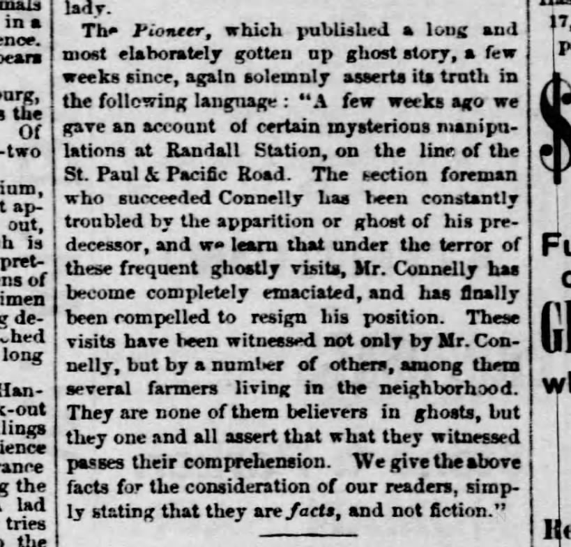 In October, an article in the St. Paul Pioneer points to the disaster while explaining the appearance of Connelly’s vengeful ghost. Though I haven’t found that original report, Minneapolis’s Star Tribune reprinted it, introducing the piece as coming from a trustworthy paper. In the days that followed, the story was picked up by papers in several other states, including The New York Times. It even spread as far England and Scotland. Indeed, news of Connelly’s ghost traveled beyond the reach of the railroad.