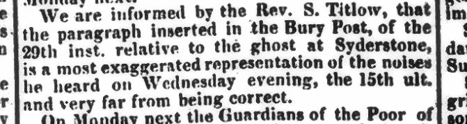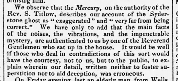 With an ecclesiastic eyeroll, Titlow wrote to the Norfolk Chronicle, yet another competing paper. It was common practice for newspapers to freely reprint — often, word-for-word — what had appeared in other papers, and the Chronicle had done exactly that with the Post’s report on the ghost hunt. (There’s a reprint of the latter article here.) Apparently, Titlow was covering all bases by writing to multiple journals.