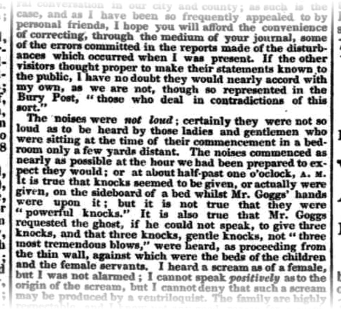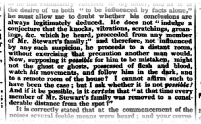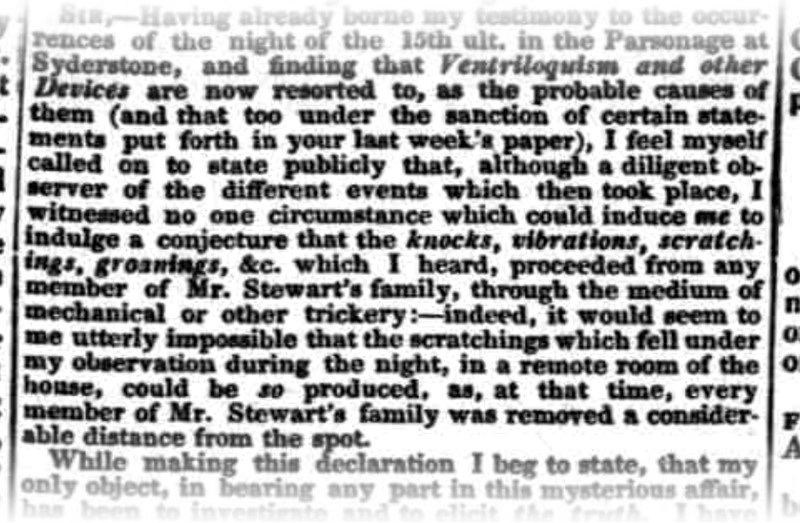 It’s very likely that, once Spurgin’s letter was printed, he saw Titlow’s encouraging further investigation with the Stewarts “at a distance.” He might also have read John Baker publicly contending that a ventriloquist was behind the haunting (as discussed in Part 1), though apparently Baker wasn’t the only one putting forth that idea. Very definitely, Spurgin wrote additional letters intended to defend the Stewarts’ innocence. In one, he opens by saying that mounting aspersions against the family impelled him to protest: