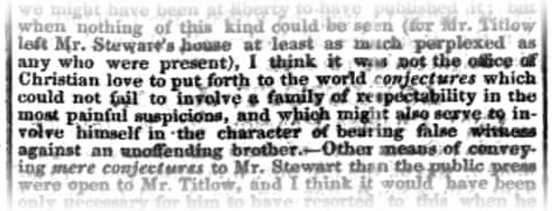Titlow saw Spurgin’s follow-up letter as a personal attack. In his own second letter to the Chronicle, Titlow reminds readers that he had carefully praised the Stewarts’ respectability while also contending that “it is possible for one or two family members to cause disturbances to the rest.” He merely pointed out the possibility and then nudged Stewart toward allowing an investigation with the family absent to help arrive at some substantial conclusion about the case.
