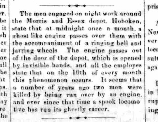 Five years later, a phantom locomotive was reported to appear at the Broad Street Station. It was tied to that night of death and narrow escapes. For some reason — maybe simply the passage of time — the earliest report I’ve found links the manifestation to Hoboken, where Nichols was headed, instead of to Newark, where he died.