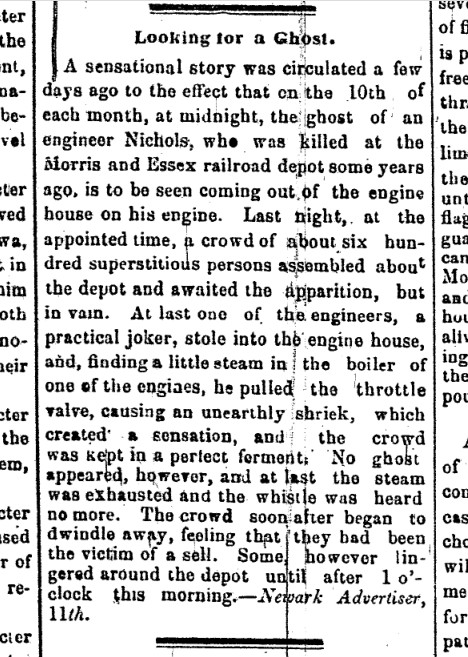 From there, the news traveled to places such as Maine, Virginia, Ohio, and Tennessee. All of the newspapers in these states attribute Newark’s Courier as their source, saying that the wreck that led to Nichols’ death had occurred on October 10th. This is incorrect, of course, but without the remarkably handy technology of online archives, who would know? Admittedly, this mistake, the failure of the spectral locomotive to appear, and the “practical joker” mentioned above combine to give this case the fragrance of a hoax or, at the very least, of a tall tale.