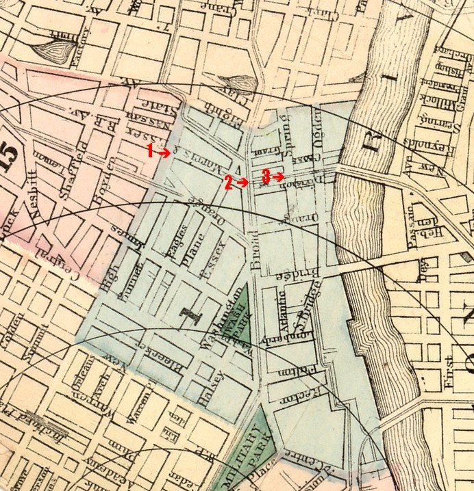 On September 26, 1868, a train tragedy occurred in Newark, which the New York Herald described the next day as a “collision of a serious character.” On the 28th, a fuller account appeared in the Elizabeth Daily Monitor, and here we learn that the collision involved a train belonging to the Morris & Essex Railroad (M&E). The engine, hauling 36 cars of coal, “was brought to a standstill at High street, on the heavy down grade of the road, about one-eighth of a mile from the depot….” (See 1 on the map below.) Battling gravity and wet tracks, engineer Nathan Nichols was unable to keep the train from slipping downhill, and it resumed its course “with fearful velocity.” The fireman, brakeman, and conductor each managed to leap off before the engine collided with another train sitting at Park Street. (See 2.) With Nichols still at his post, the coal train derailed. It continued on, sideswiping “a dwelling house, occupied by a family named Conkling, on the northeast corner of Spring and Division streets.” (See 3.) This was enough to bring the runaway locomotive to a terrible halt.