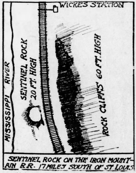 There is a curve in the tracks near Wickes, Missouri, that skirts a rock formation called Sentinel Rock. Starting around 1885, railroad workers passing by saw a ghost standing on top of this rock. Maybe standing isn’t quite right, since the apparition was that of a “half man,” the figure a person from the waist up, according to a lengthy article in the May 27, 1906, issue of the St. Louis Post-Dispatch. That report also says that tales of the ghost had been circulating among railroaders for twenty years, and “today it is probably the most talked-about railroad ghost story in the world.”