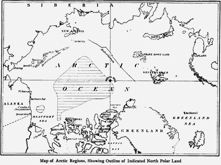 Now, whether a mirage or a lie, Crocker Land was bolstered by a 1904 essay by Dr. Rollin A. Harris, who advanced a theory regarding, as his title suggests, “Some Indications of Land in the Vicinity of the North Pole.” (Welky relates Peary’s claim to Harris’s theory on p. 261.) Harris refers to this hypothetical place as “a large tract of land dividing the deep Arctic channel” (p. 257), but he doesn’t use the word continent.