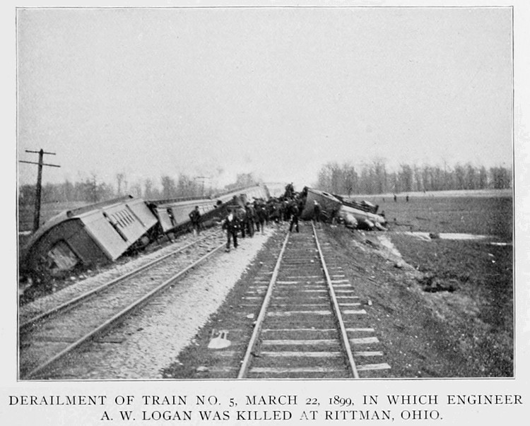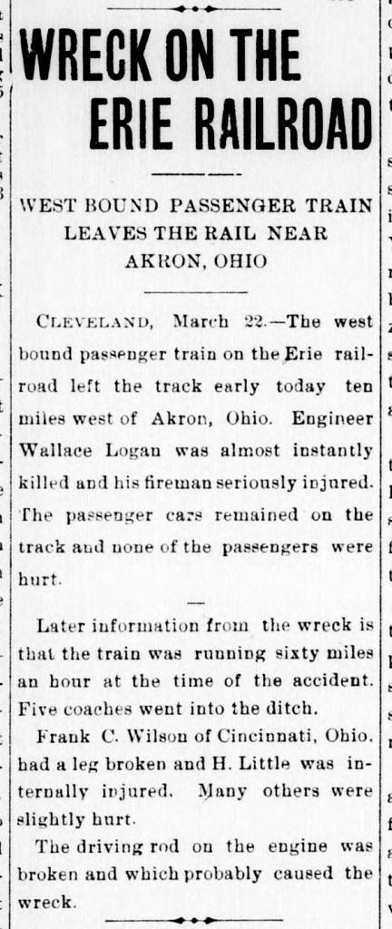 On March 22, 1899, a westbound train derailed near Rittman, Ohio. One source reports that the train had been running at 60 miles an hour, and a later one explains that speeding along this stretch of the Erie Railroad allowed engineers to stay on schedule. Unfortunately, on that run in March, the No. 5 broke a driving rod, which probably lead to the wreck. (Another source uses the term “parallel rod,” but clearly it was some sort of engine trouble.) With even greater speed, news of the tragedy reached Washington, D.C., later that same day and California the very next.
