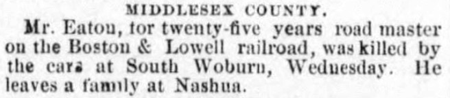 If nothing else, this provides a distinctive backstory to a railroad haunting that was chronicled in newspapers in early 1870. But Eaton’s spirit isn’t the only candidate to explain the haunting. A list of accidents on the Boston & Lowell line appears in an 1867 report on railroad corporations, and Eaton’s death is accompanied by another possibility: “August 12. — Sumner Clark, while walking on the track near East Woburn, was struck by a train, receiving injuries which caused his death.” However, Eaton’s professional dedication to railroad safety — and the probability that his accident occurred at Woburn Watering Place — make him a better fit for the specific manifestations of the haunting.