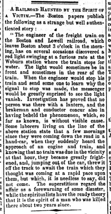 As I say, this is very likely where roadmaster James Bradford Eaton lost his life while scrambling to retrieve his false teeth. This is very likely where, a bit more than two years later, a ghostly red light was reported to swing “at a furious rate.” Does this phenomenon — or the sound of a phantom train — still linger? Please let us know in the comments if you do any investigation. And if you’re disappointed there, consider exploring nearby Horn Pond, reputed to be the site of a variety of paranormal manifestations.