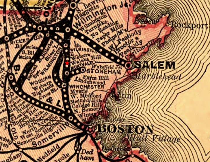 Now, the ghost report is very vague about where the phantom train was heard. I think that might be a lost cause. We can do much better with the spectral red light, though, because it was observed “where the train stops for water.” There’s that stop marked as such on the 1867 schedule, and according to a 1918 history of the Boston & Lowell, “For many years the station now called Walnut Hill was known as Woburn Watering Station.” Walnut Hill is marked on the 1890 map, and it remains an eastern neighborhood of Woburn today. An interested ghost hunter might use this location to carefully explore the tracks that still run — and are still used — between Winchester and Wilmington. They run parallel to and east of Wildwood Avenue.