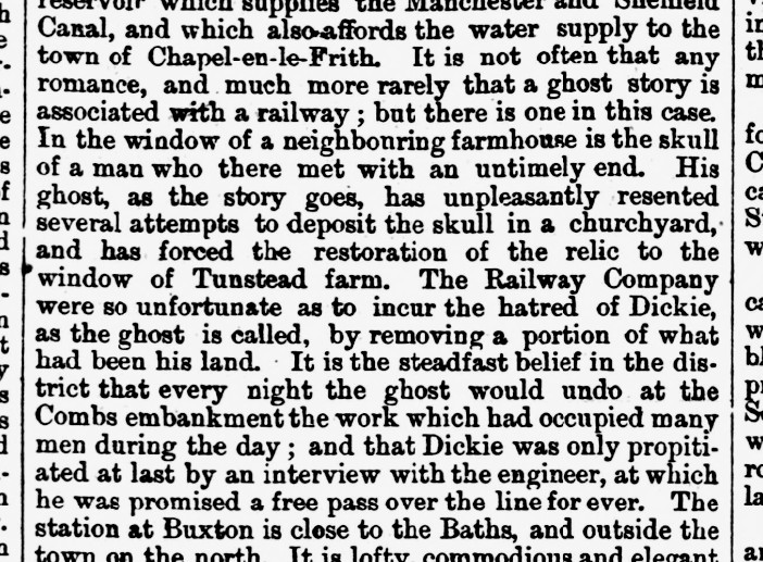 Wood’s book probably had a hand in shaping a railroad haunting involving the skull, given that the work had been published just one year earlier. You see, in 1863 — when Stockport, Disley and Whaley Bridge Railway workers ran into trouble while laying tracks for a line from Whaley Bridge down to Buxton — they had a persnickety ghost nearby upon whom to place the blame.