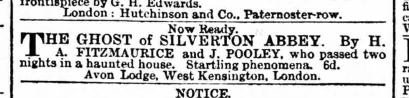 Something that might’ve fit nicely in The Victorian Ghost Hunter’s Casebook is a 16-page pamphlet titled The Ghost of Silverton Abbey: A True Story. It was published in 1896 and written by H.A. Fitz-Maurice and J. Pooley. Unfortunately, it’s extremely rare, and a guy who pounces on a free trial to Newspapers.com ain’t going to buy a ticket from the North American Great Plains to Britain to see it. (Of course, there are other very nice things one might visit in Britain, but that’s a discussion for another time.)