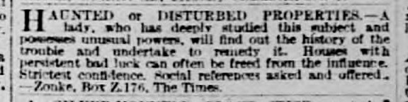 Yet, quite a few years ago, I came upon and blogged about a 1919 advertisement with the heading: “HAUNTED OR DISTURBED PROPERTIES.” The ad, run in London’s The Times, offers aid from a person who “will find out the history of the trouble and undertake to remedy it.” This has intriguing similarities to an ad run by Van Slyke, as discussed in Help for the Haunted: A Decade of Vera Van Slyke Ghostly Mysteries. However, I had never seen the quirky ad itself until now: