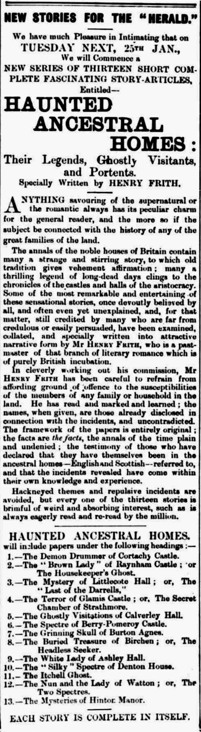In January of 1892, British newspapers from Angus, Scotland, down to Hampshire, England, announced they would be running a 13-part series. It was titled “Haunted Ancestral Homes: Their Legends, Ghostly Visitants, and Portents” and was written by Henry Frith. Here’s what that announcement looked like in the January 19 issue of the Brechin Herald: