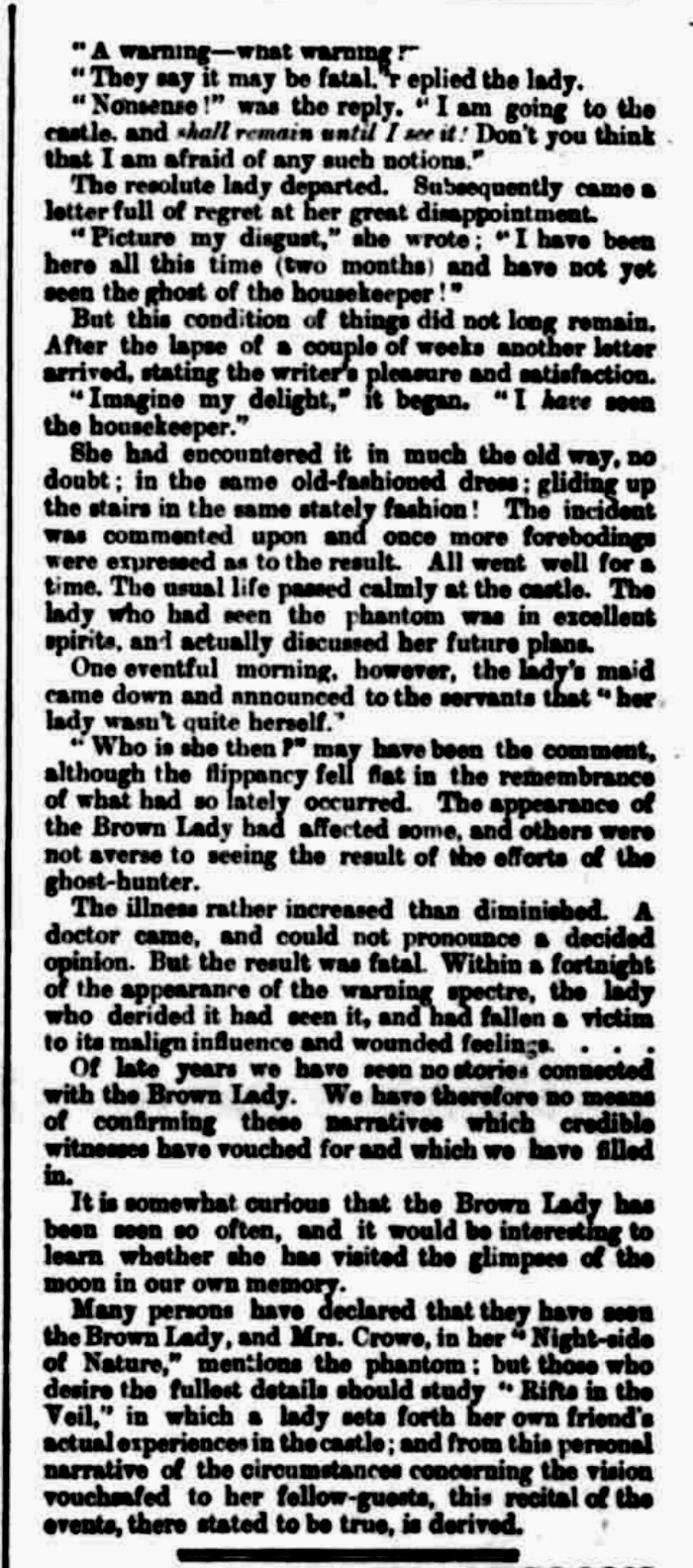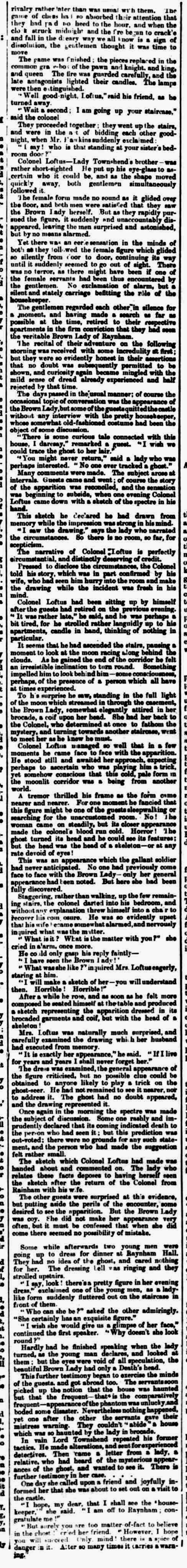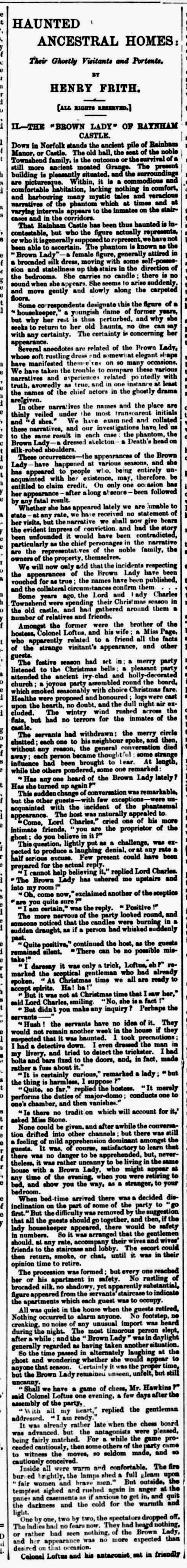 Frith’s references are to Catherine Crowe’s chapter on haunted houses in Volume 2 of The Night Side of Nature; Or, Ghosts and Ghost Seers (T.C. Newby, 1848) pp. 73-74 and to Lucia C. Stone’s “The Brown Lady of Rainham,” found in Rifts in the Veil: A Collection of Inspirational Poems and Essays Given Through Various Forms of Mediumship (W.H. Harrison, 1878) pp. 97-98.