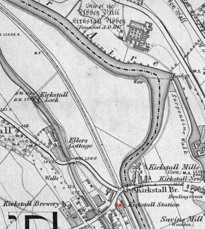 This railroad haunting presents a couple of hurdles. First, the station platform from which the ghost was observed no longer exists: the Pennine Horizons Digital Archive reports that Kirkstall Station in West Yorkshire, England, “closed in 1965.” That online archive provides a nice photo of the place, though, and there’s another one here. Nonetheless, comparing this 1851 map to what we see today, we find that Kirkstall Station stood between the River Aire and what’s now called Wyther Lane, just below the B6157 bridge. The station might be gone, but we know where it was.