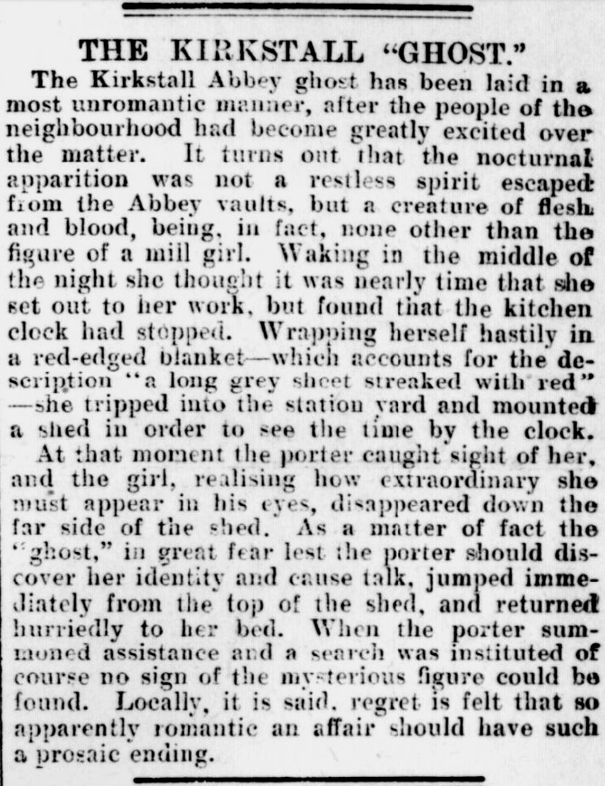 The piece in The Herald ends with a short bit about how all three witnesses had been fooled. It says the alleged ghost was really “a mill girl, who, rising early, went out wrapped in a blanket, and mounted the shed in the goods yard in order to see the time by the station clock.” Well. Perhaps. Odd for 1904, when timepieces were fairly common, isn’t it? And why did the mill employee climb up on the shed repeatedly? And why was she “gesticulating”? Was she attacked by a swarm of moths?