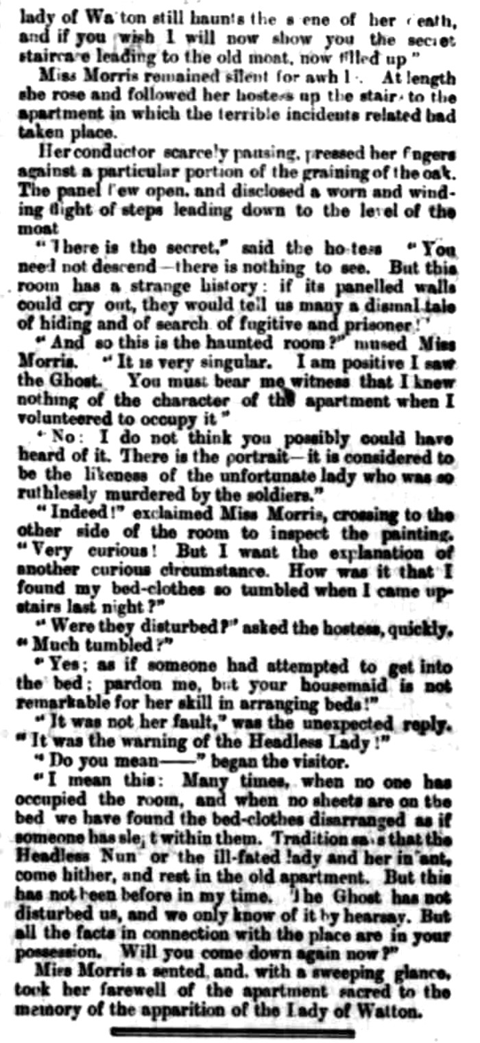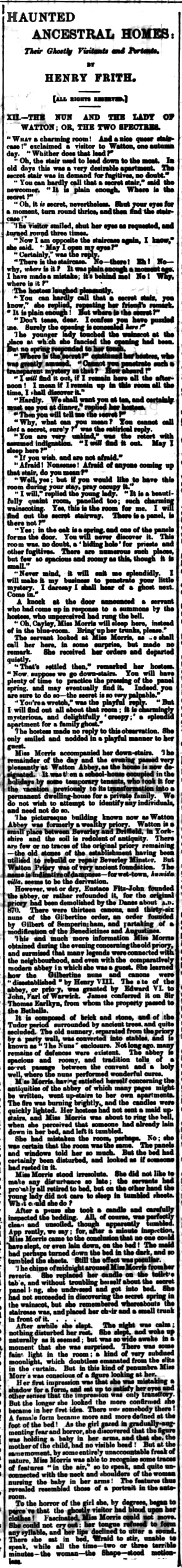Watton Abbey (a.k.a. Watton Priory) still stands, but it is a private residence. Sites interested in the structure’s haunted history — such as Mysterious Britain & Ireland and Walking the Wolds— follow the Watton Abbey chapter in John Ingram’s The Haunted Homes and Family Traditions of Great Britain (1884). Ingram, in turn, gets his information from a newspaper series on Yorkshire lore.