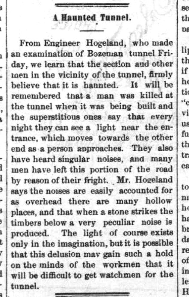 But here’s one set in a train tunnel in the Rocky Mountains, roughly fifteen miles east of Bozeman, Montana. Originally part of the Northern Pacific Railroad, the tunnel was constructed between 1882 and 1884, and a report that it might be haunted appeared in April of 1885. Unlike some of the cases I’ve researched, news of this one doesn’t seem to have traveled very far, not even beyond what was then the Montana Territory. The earliest article I’ve found was in The Bozeman Weekly Chronicle, and this was reprinted in the Helena Weekly Herald about a week later. A week after that, it was summarized in The Billings Herald.